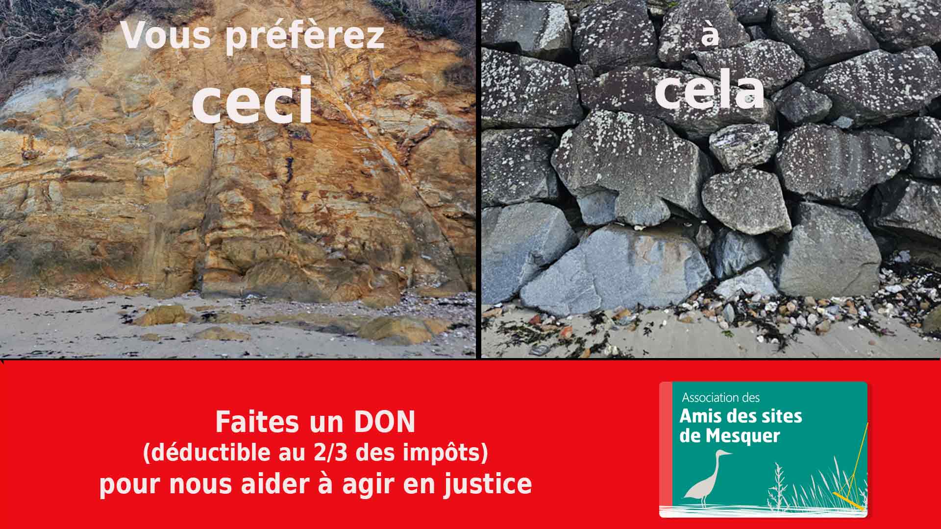 Depuis des dizaines d’années, les falaises du Cabonnais sont dénaturées par des enrochements qui enlaidissent ce site patrimonial. Une étude scientifique du BRGM prouve que les propriétés des riverains ne sont pas en danger. Le recul étant dû à la pluie et non à l’action de la mer. Avec le temps, les anciens enrochements s’effondrent et mettent en danger la sécurité des passants. Vous comprendrez pourquoi, l'association des Amis des sites de Mesquer a lancé une action en justice, pour empêcher deux nouveaux enrochements dont les autorisations ont été accordées par la mairie. Votre don au 2/3 déductible de vos impôts nous aidera grandement à préserver, voire à restaurer le site.
